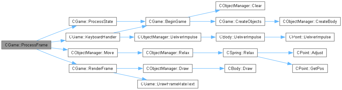 This function will be called regularly to process and render a frame of animation, which involves the following. Handle keyboard input. Notify the sound player at the start of each frame so that it can prevent multiple copies of a sound from starting on the same frame. Move the game objects. Render a frame of animation. Process any changes to the current game state.