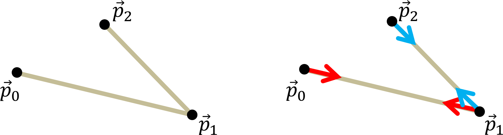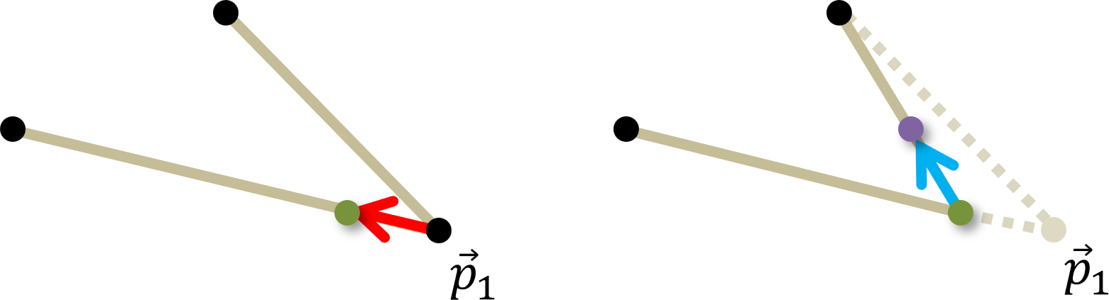 Now suppose that we have two sticks with one end point in common such that they can freely rotate about this point. Suppose one stick has end points \(p_0\) and \(p_1\), and the other stick has end points \(p_1\) and \(p_2\) as shown in Fig. 8, left. Further suppose that both sticks have the wrong length and need to be corrected as shown in Fig. 8, right. We could try relaxing one stick and then the other, but the result will be wrong as shown in Fig. 9. The shared point \(\vec{p}_1\) will be first moved to the green point in Fig. 9, left, then to the purple point in Fig. 9, right. As we see in in Fig. 9 right, the purple point is not on the stick with end points \(p_1\) and \(p_2\).