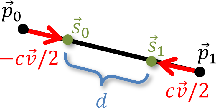 . Let the new end points of the stick be \(\vec{s}_0 = \vec{p}_0 - c\vec{v}/2\) and \(\vec{s}_1 = \vec{p}_1 + c\vec{v}/2\) as shown in Fig. 6. The length of this stick is then \(\Vert\vec{s}_0 - \vec{s}_1\Vert = \Vert\vec{v}\Vert -(1-d/\Vert\vec{v}\Vert)\Vert\vec{v}\Vert = d\). This process is called relaxation.