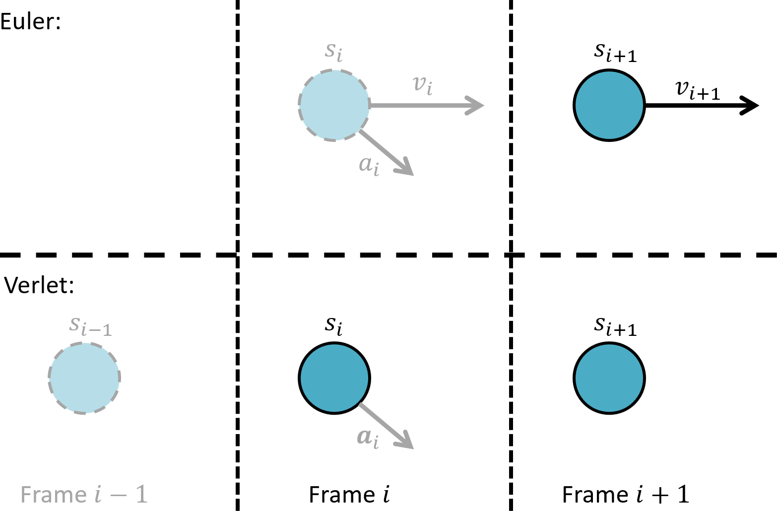 This method is commonly referred to as Euler integration. Contrast this with Equation (1) above for Verlet integration. Fig 4. summarizes the differences between Verlet and Euler integration.