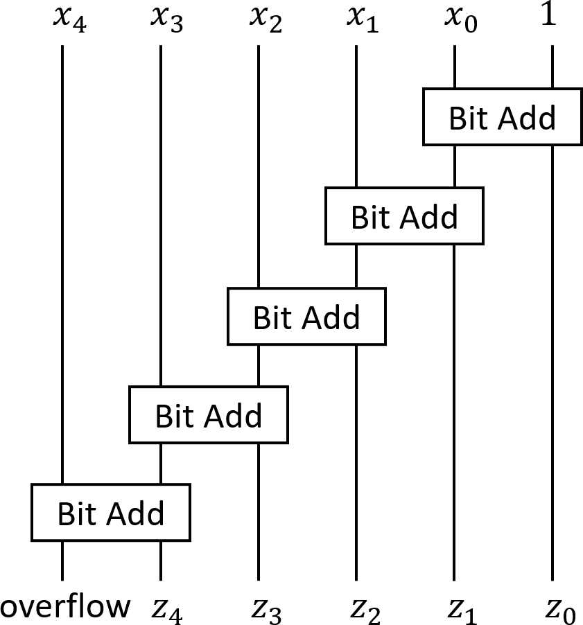 Now suppose we wish to increment the binary number \(x_4x_3x_2x_1x_0\) to get the result \(z_4z_3z_2z_1z_0\) and an overflow bit. We simply cascade five single bit counters with the carry from one going to the input of the next as shown in Fig. 8. This should be familiar to you if you have taken an elementary hardware or computer organization class.