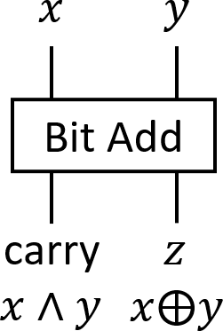 Let \(x\) and \(y\) be single bits. When \(x\) and \(y\) are added together, the result is the exclusive-or \(z = x \oplus y\) and the carry bit is the conjunction \(x \wedge y\). This gives us the single-bit counter shown in Fig. 6.