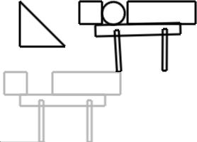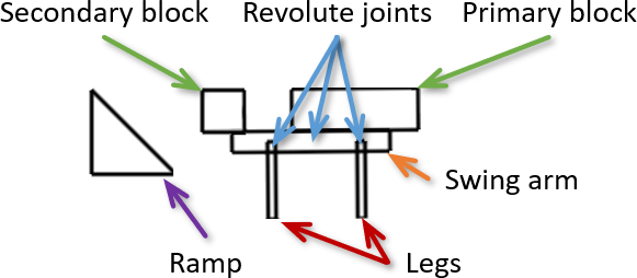Our single bit counter consists of two rectangular blocks (primary and secondary), a triangular ramp, a rectangular swing arm, and two rectangular legs, and three revolute joints as shown in Fig. 7. There is a revolute joint at the center of the swing arm connecting it to the null background, and a revolute joint at the top of each leg joining it to one of the two ends of the swing arm. It is implemented in code by CBitCounter. Its constructor CBitCounter::CBitCounter takes as parameters the coordinates of its center in render world coordinates and a Boolean variable that is true if this is the last (i.e. null) bit counter. It uses CBitCounter::CreateRamp to create the ramp and CBitCounter::CreateBlock to create the blocks, swing arm, and legs.