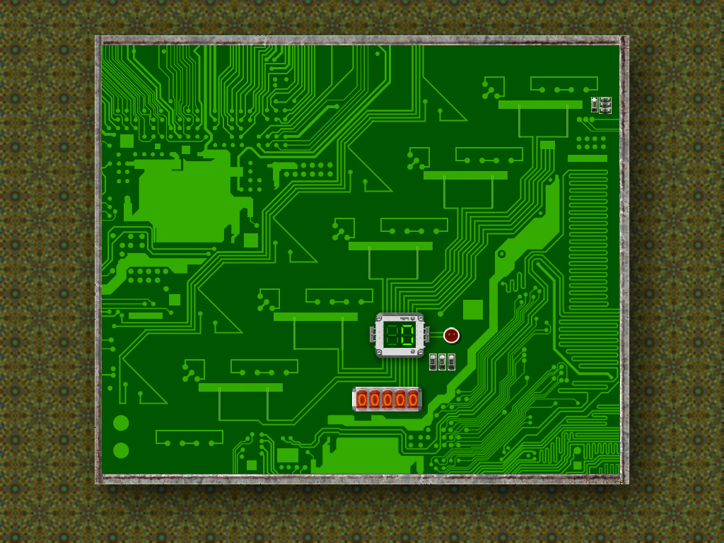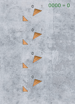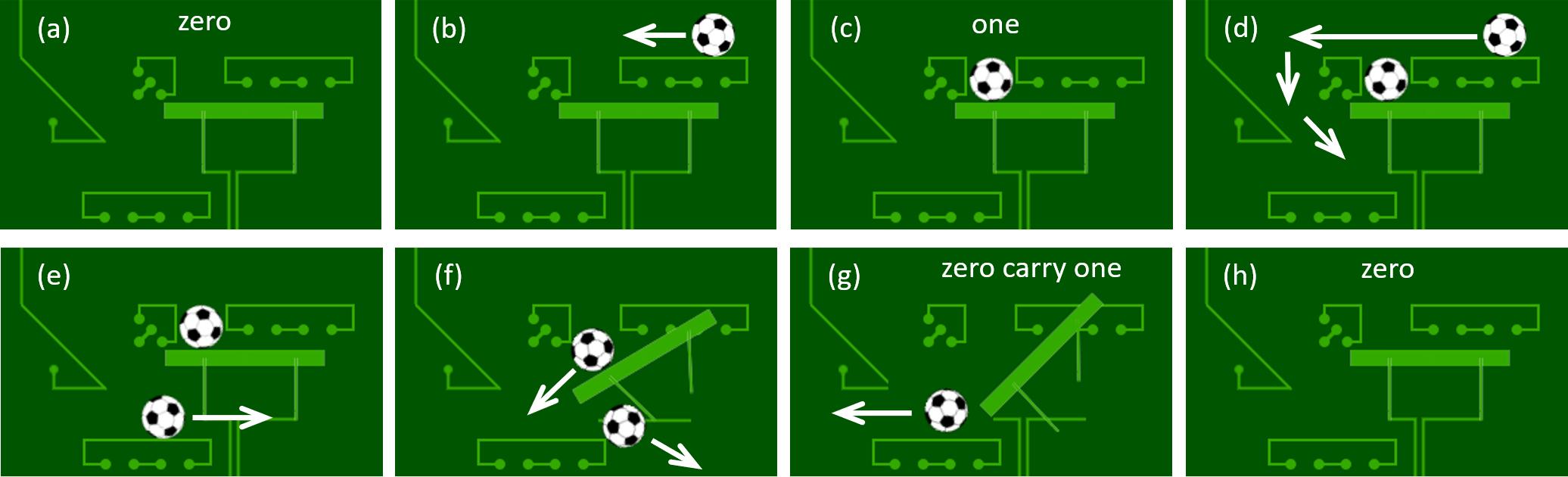 Fig. 4 shows an animation of the rest states, that is, the screen shown when the balls have come to rest and the game is waiting for the user to release the next ball (see Section 2 for keyboard controls). Pay attention to the soccer balls, the binary counter, and the decimal counter (refer back to Fig. 3 is necessary). Let's look a little closer at what happens to a single bit when incrementing from 0 to 1, then incrementing from 1 to 0 resulting in a carry bit. This is shown in Fig. 5.