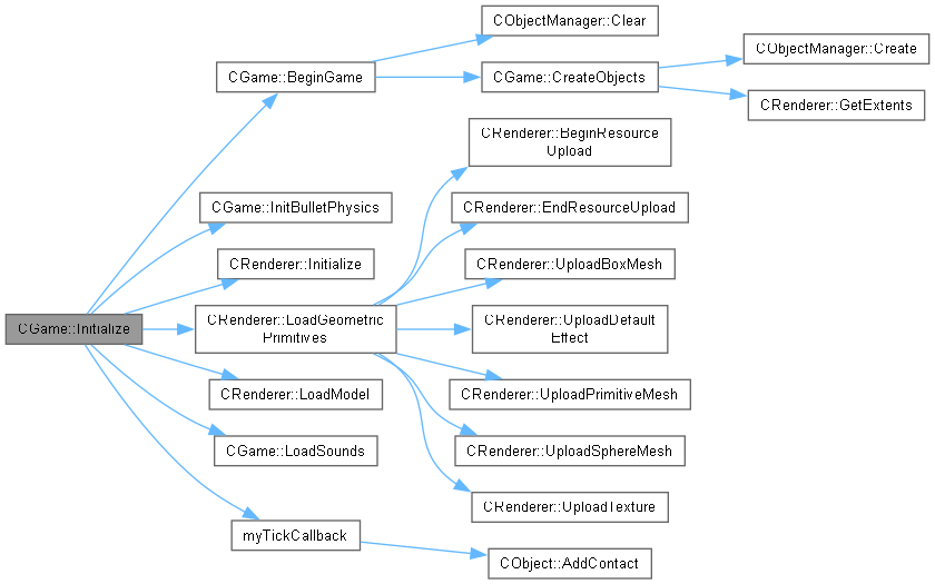 Create and initialize the renderer. Load geometric primitives and models. Initialize the sound manager and load the sounds. Create the object manager and create and initialize the step timer. Initialize the physics engine and set its tick callback to myTickCallback(). Set the camera's initial position and begin the game.