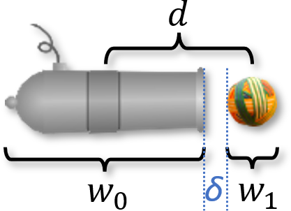 To fire a cannonball means creating one a short distance away from the muzzle of the cannon and giving it an impulse in the direction that the muzzle is facing. For example, if the cannon is pointing horizontally to the right, the cannon barrel has width \(w_0\), the cannonball has width \(w_1\), and we wish it to be created a small non-zero distance \(\delta\) in front of the cannon muzzle as shown in Fig. 8, then the center of the cannonball must be created at horizontal distance \((w_0 + w_1)/2 + \delta\) from the center of the cannon barrel and given a horizontal impulse.