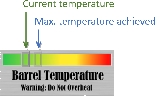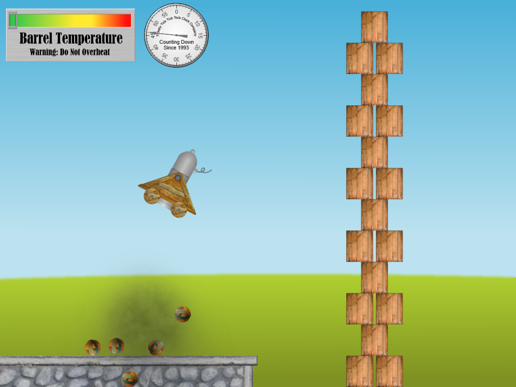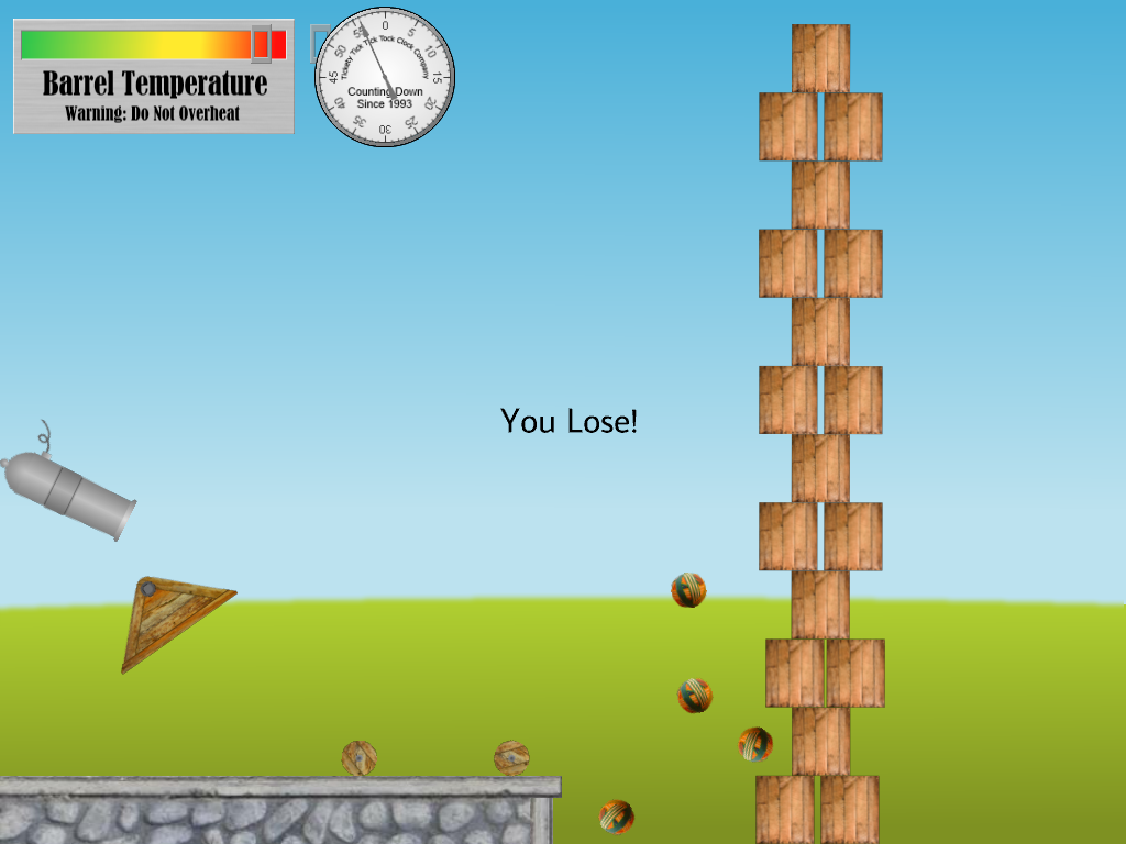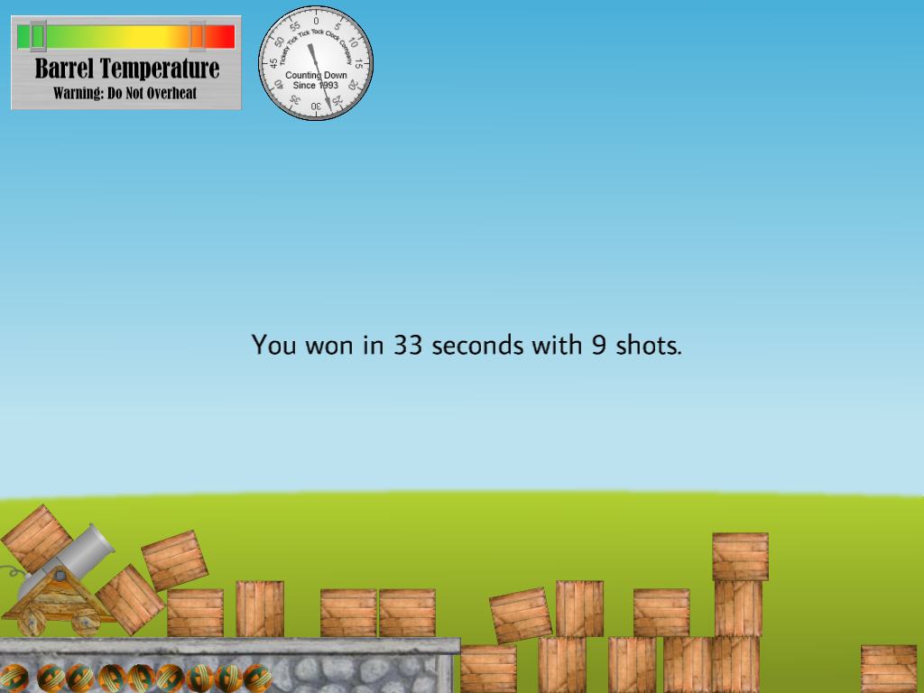You must get all of the crates below a line approximately at the horizon to win. If you win, you'll see a text message telling you how many shots you used and how much time you took (see Fig. 2). There's a HUD at top left of the window with a gauge that tells you the cannon's current temperature and the maximum temperature experienced so far (see Fig. 4). Firing the cannon increases the temperature and it cools over the next few seconds. If the cannon overheats, then it will explode when next fired and you lose (see Fig. 3). You have 60 seconds in which to knock down the tower. There's a stopwatch to the right of the temperature gauge so you can see how much time is remaining.