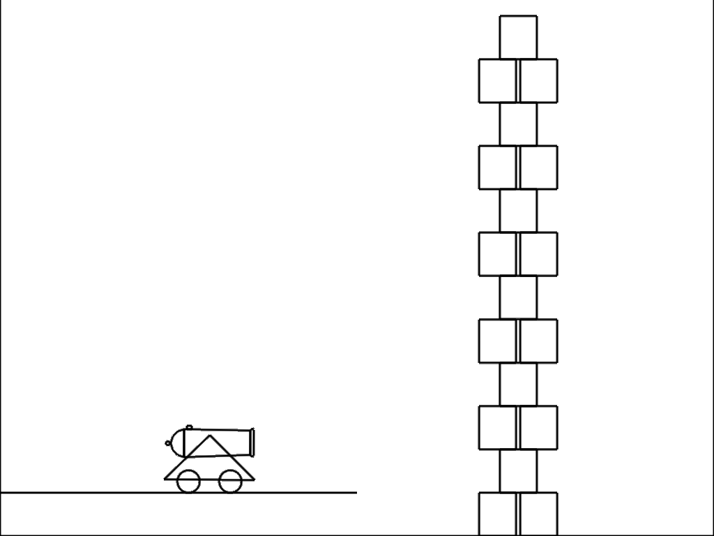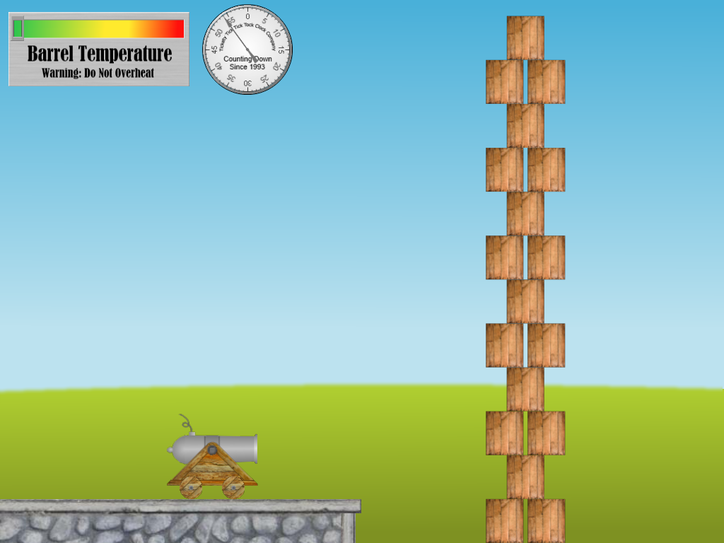 The Cannon Game demonstrates how to make a simple minigame using Box2D building on concepts from the Box2D Bouncy Things Toy and the Box2D Joint Toy. It consists of a cannon resting on a stone wall, a stack of crates, and a heads-up display consisting of a temperature gauge and a stopwatch, as shown in Fig. 1.