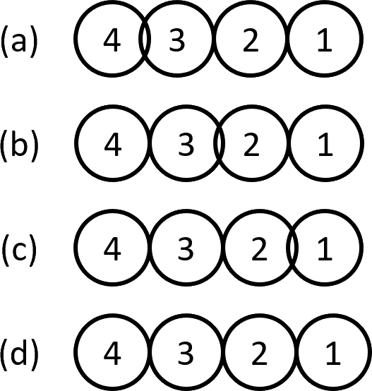 The reason for doing more than one collision iteration per frame is because collision detection and response may move a shape in such a way that it now collides with an object that it formerly didn't. For example, consider a 2D simulation of Newton's Cradle with four circles numbered 1 through 4 that touch in a straight line. Suppose that circle 4 has been moved so that it overlaps circle 3, as shown in Fig. 16. Now suppose that the object manager has these shapes in ascending order, that is, Shape 1, then 2, then 3, then 4. Brute force broad phase collision detection and response will call narrow phase for the following unordered pairs of circles. However, only the last one (in red) will detect a collision.
