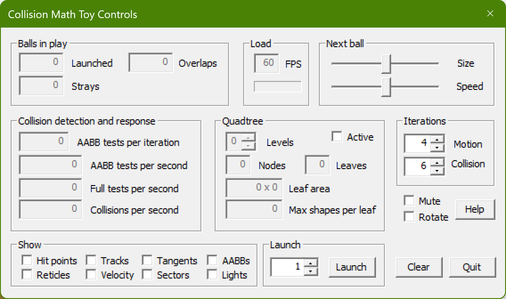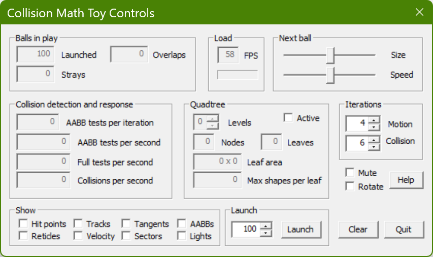 The Collision Math Toy is controlled by the dialog box shown in Fig. 2, which is divided up into regions as described below.