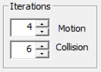 CObjectManager::Move iterates through the dynamic and kinematic shapes pointed to by its objects, calling Shapes::CShape::move or in most cases, the appropriate function derived from it. More correctly, CObjectManager::Move does this in a loop CCommon::m_nMIterations times (the M stands for motion iterations). This value can be modifed in real time using the Iterations region of the Controls dialog box. Why would you have more than one motion iteration? It is so that the shapes move less far in each motion so that tunneling is mitigated or avoided. How is that handled in our code? When the number of iterations is changed in the dialog box, a callback function CDialogBox::DlgProc in DialogBox.cpp changes the value of Shapes::CShapeCommon::m_fTimeStep. This value then gets used in Shapes::CDynamicCircle::move and Shapes::CShape::move to scale back translation and rotation, respectively.