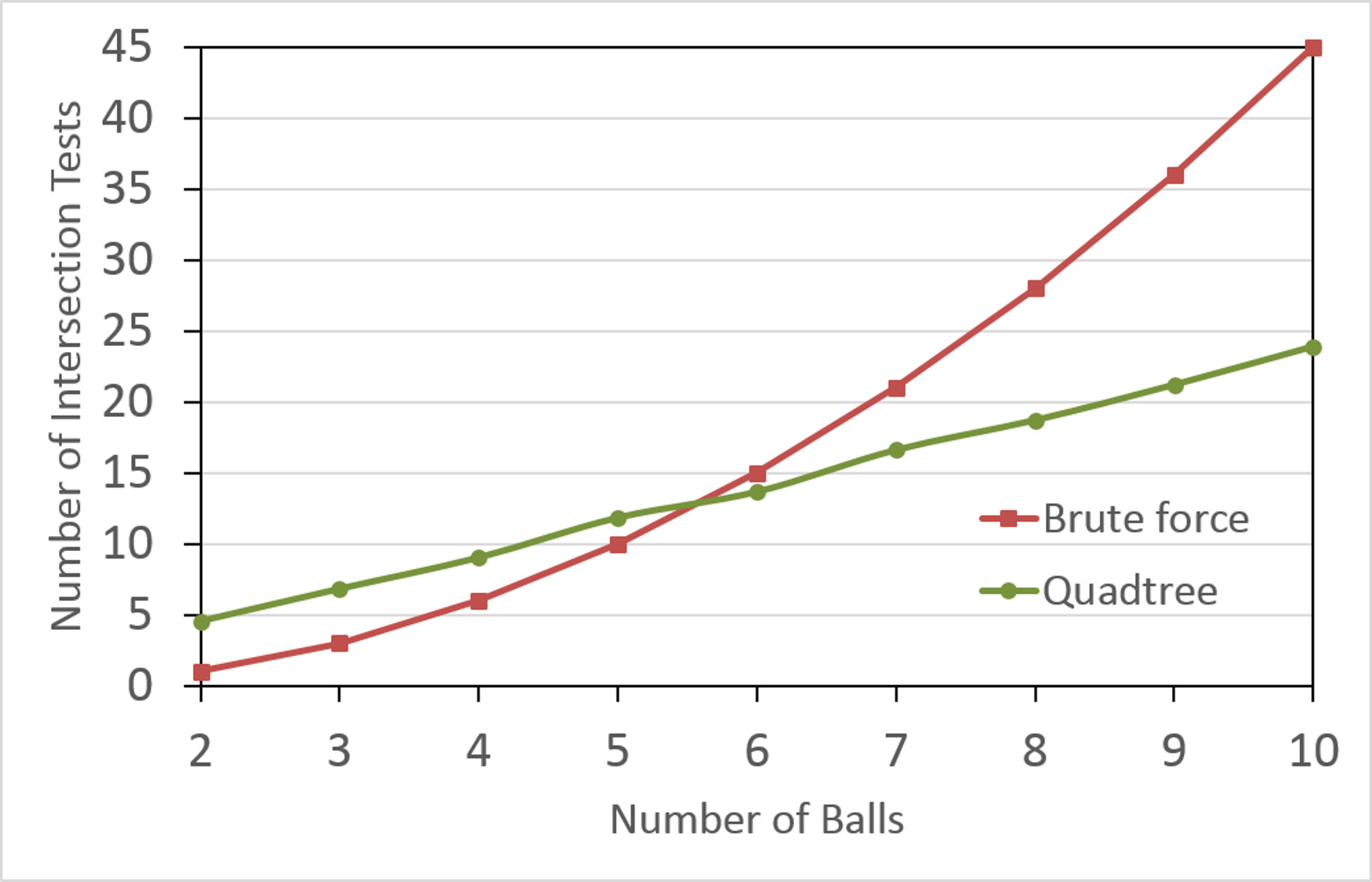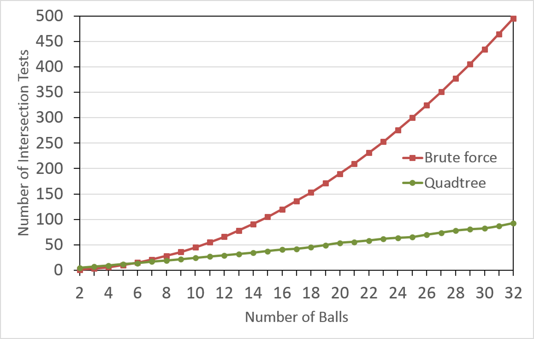 Fig. 26 shows the number of AABB intersection tests used during broad phase collision detection and response for \(2 \leq n \leq 32\) balls, with the brute force figures in red and the quadtree figures in green. Note that the quadtree method very quickly becomes more efficient than the brute force method with quadtrees winning by a factor of 5 for \(n=32\) balls.