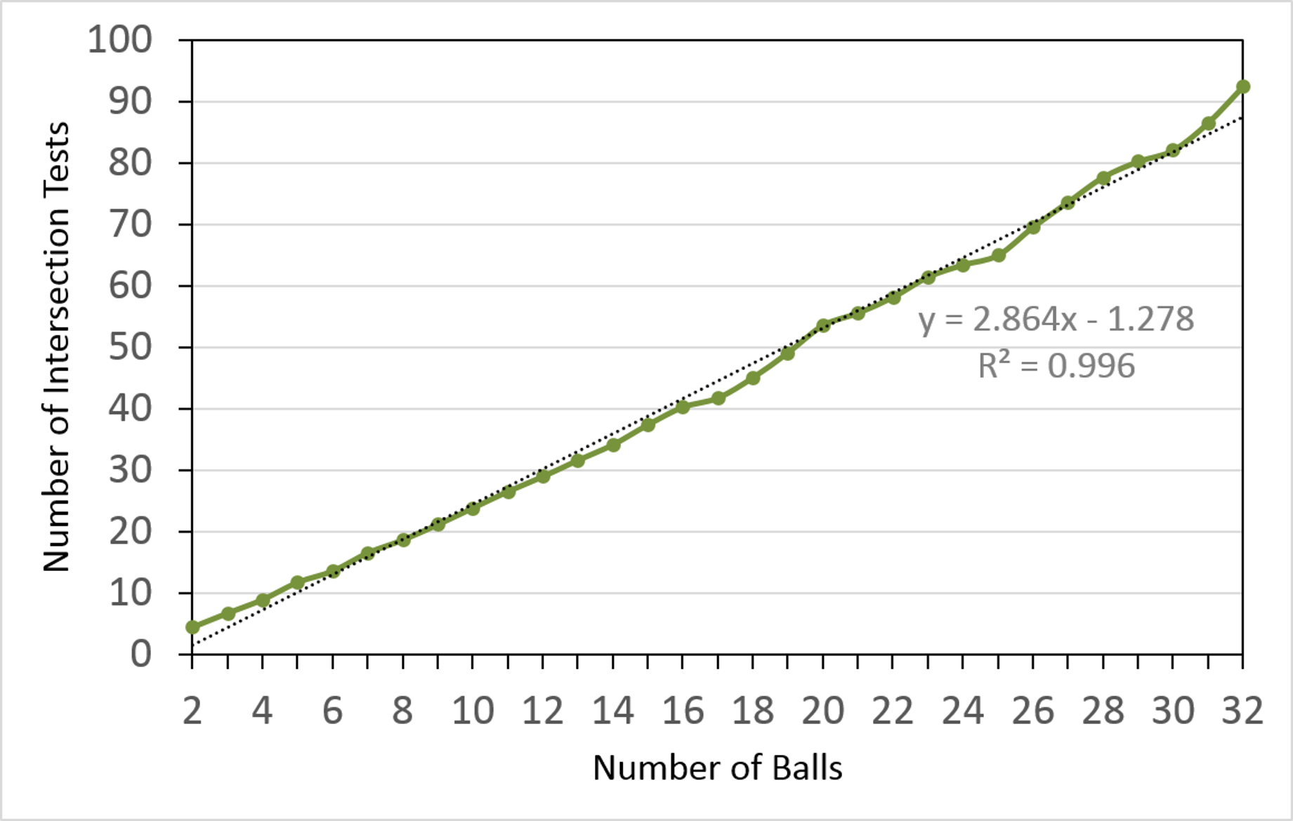 We made the claim above that for reasonable values of \(N\), \(k\), and \(m\), quadtree collision detection and response runs in time \(O(n)\). Fig. 28 shows the result of curve-fitting our results to a linear function using Microsoft Excel. It reports that the number of AABB intersection tests is slightly less than 3 times the number of balls with certainty \(R^2 = 0.996\), which is pretty close to linear in \(n\).
