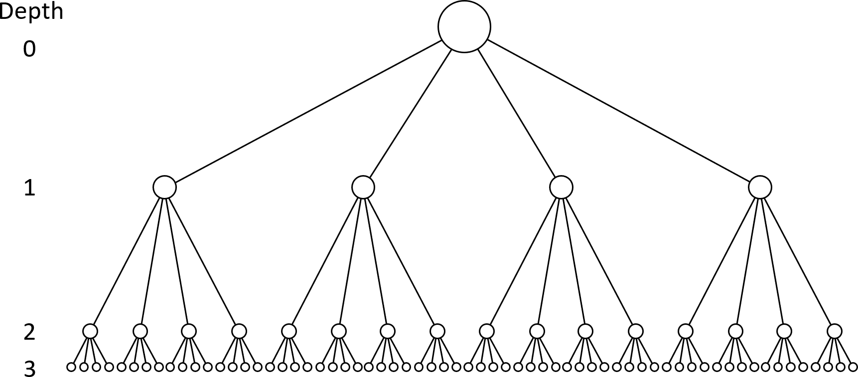 A quadtree is a full 4-ary tree in which each node represents an AABB covering part of the game world. That is, it is a tree in which every non-leaf node has exactly 4 children and every leaf is at exactly depth \(d\) from the root, where the depth of a node is the minimum number of edges that must be traversed from the node to the root. For example, Fig. 18 shows the depth of the nodes at each level. The depth of a quadtree is the depth of its leaves, which is 3 in Fig. 18.