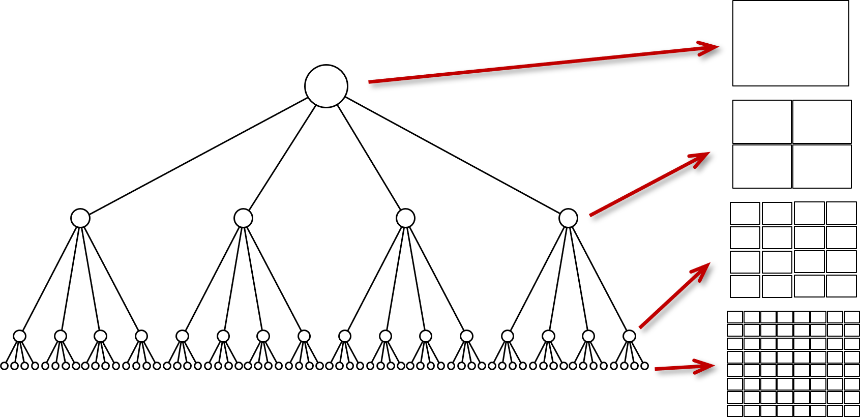 The root of a quadtree contains an AABB that contains the whole of the game world. The 4 children of a node subdivide the AABBs of their parent into 4 equal quadrants. For example, Fig. 19 shows the AABBs stored at the nodes of each level of the quadtree.