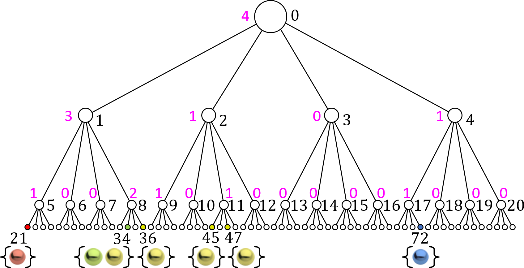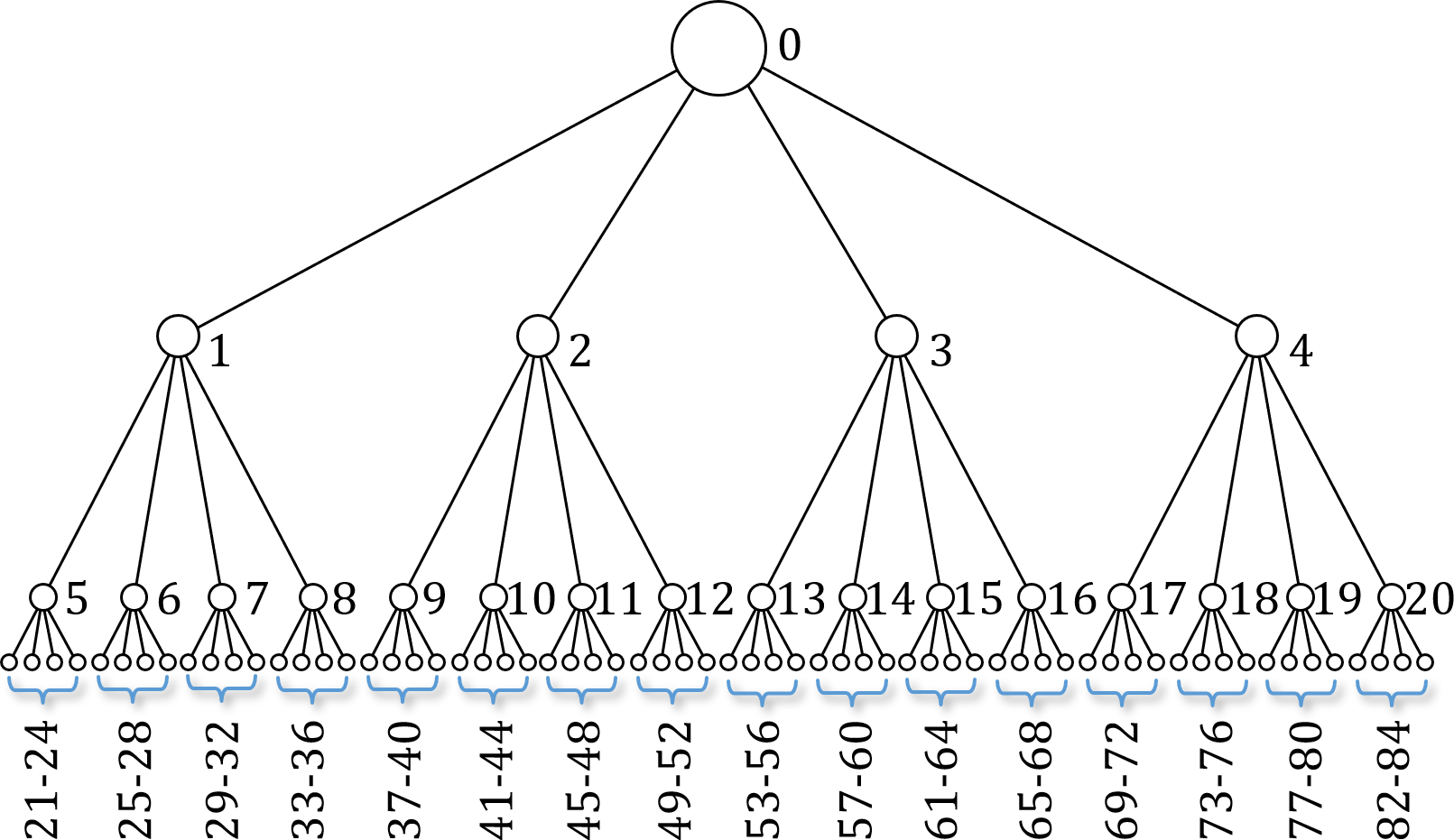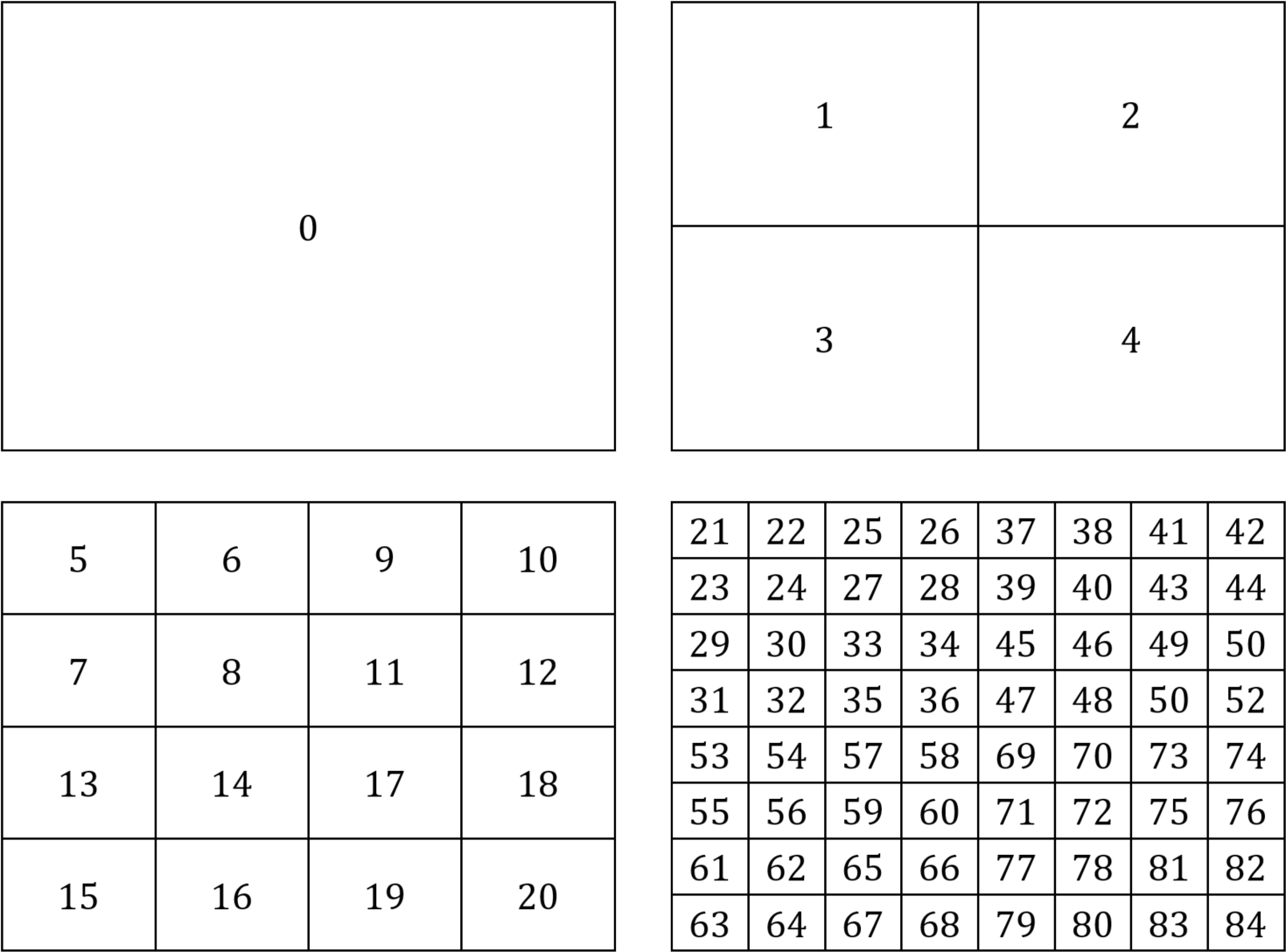 We can store an \(n\)-node quadtree in an array \(A[n]\) as follows. The root node is stored at \(A[0]\). The children of the node in \(A[i]\) are stored in nodes \(A[4i+1]\), \(A[4i+2]\), \(A[4i+3]\), and \(A[4i+4]\). The parent of the node in \(A[i]\) is in node \(A[\lfloor (i-1)/4 \rfloor]\). Fig. 20 shows the indices into \(A\) for the nodes of a depth 3, 85-node quadtree. Fig. 21 shows the AABBs labeled with the indices into \(A\) for the nodes of a depth 3, 85-node quadtree.