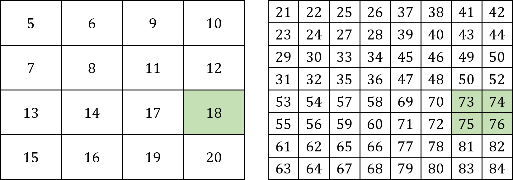 For example, since \(4 \times 18 = 72\), the children of the node at \(A[18]\) are at nodes \(A[73]\), \(A[74]\), \(A[75]\), and \(A[76]\), and since \(\lfloor 72/4\rfloor = \lfloor 73/4\rfloor = \lfloor 74/4\rfloor = \lfloor 75/4\rfloor = 18\), the parent of nodes \(A[73]\), \(A[74]\), \(A[75]\), and \(A[76]\) is in \(A[18]\) (see Fig. 22).