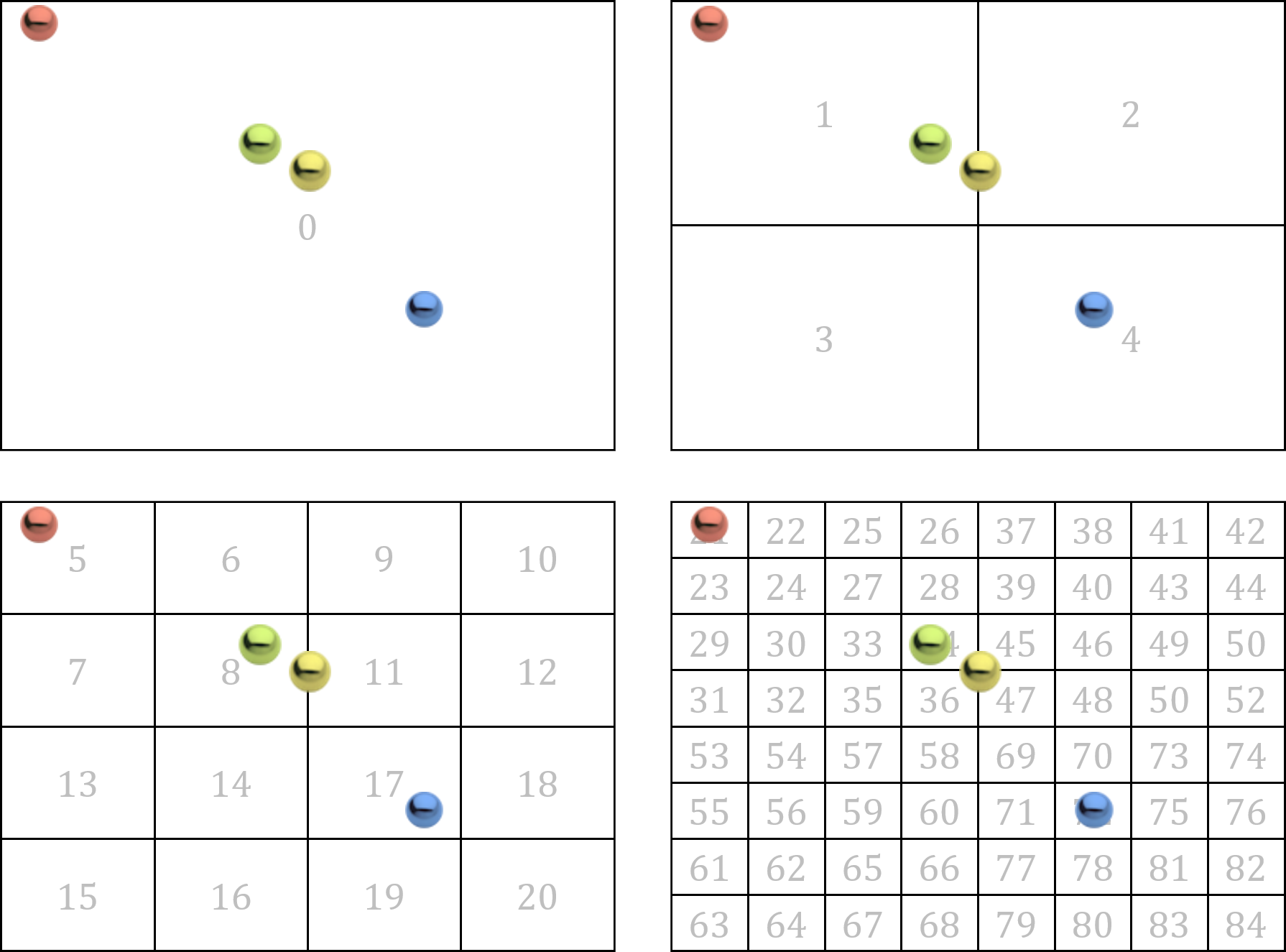 Consider the areas covered by the nodes of the quadtree of depth 3 shown in Fig. 24 with four colored balls drawn at their places in the game world.