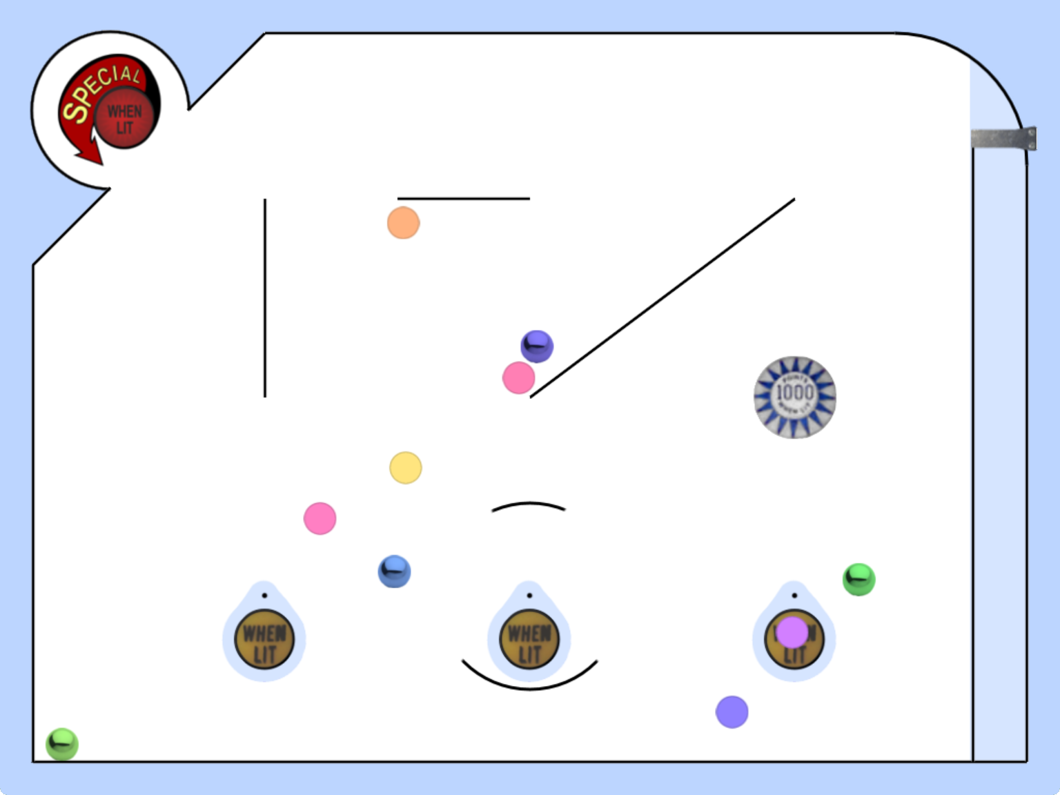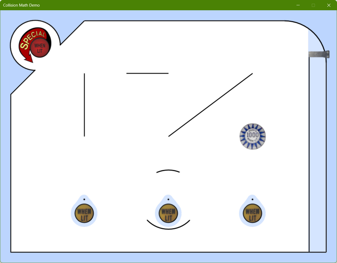This is a collision detection and response toy intended to help you visualize what's going on in the in the Shapes Library by experimenting with various settings and measurements using a dialog box. Fig. 1 shows a screenshot of the toy before any balls are launched. Balls are launched from the bottom right corner and travel vertically before hitting the arc in the top right corner and entering the main play area. There are various shapes to collide with, including line segments, points, arcs, and circles. Two objects, the convex arc at the top left corner and the pinball bumper at the middle right, have an elasticity greater than 1.0f, that is, they increase the velocity of balls that collide with them. Some of the line segments and arcs have motion type Shapes::eMotion::Kinematic, although they start out with rotational velocity zero until you select the Rotate checkbox in the Other area of the dialog box controls, at which time they will have a constant but non-zero rotational velocity.