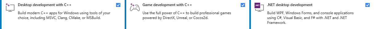 Download and install Visual Studio Community from https://visualstudio.microsoft.com/downloads/. It's free, as opposed to the other versions of Visual Studio such as Professional and Enterprise. Make sure that you choose the following three workloads (also shown in Fig. 1): Desktop development with C++, Game development with C++, and .NET desktop development. If your computer already has Microsoft Visual Studio installed but you do not have all of these workloads, you can install them from within Visual Studio without having to deinstall and reinstall the whole thing.