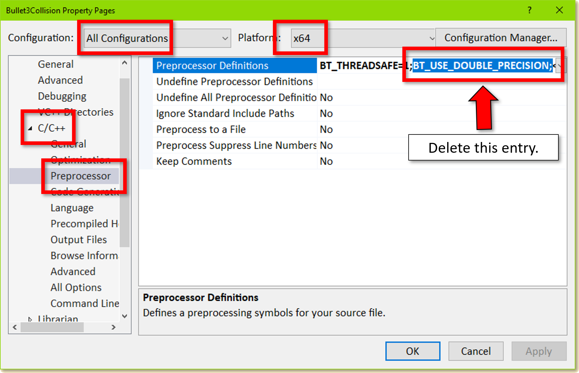 In the Visual Studio Solution Explorer, select the projects BulletCollision, BulletDynamics, and LinearMath (Note: not Bullet3Collision and Bullet3Dynamics). Right-click on one of them and select Properties. We have to change some settings to make it compatible with the rest of our code before we build it. Firstly we need to change the precision from double to float. In the Property pages (see Fig. 2) for All Configurations of the platform x64 select C/C++ then Preprocessor in the left pane and Preprocessor Definitions in the right pane. Delete the string BT_USE_DOUBLE_PRECISION; and click OK. This is shown in Fig. 2.