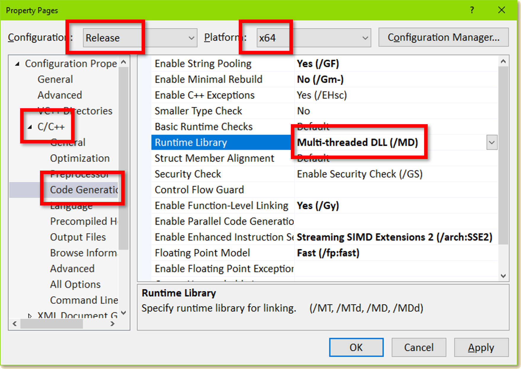 Secondly, we need to change the run-time library to Multi-threaded DLL. This is done as follows. On the same page as above, select the Release configuration of the platform x64. Next, select C/C++ then Code Generation in the left pane and Runtime Library in the right pane. Select Multi-threaded DLL (/MD) from the drop-down menu beside it. This is shown in Fig. 3. Do the same for the Debug configuration of the platform x64, but in this case select Multi-threaded Debug DLL (/MDd) from the drop-down menu.