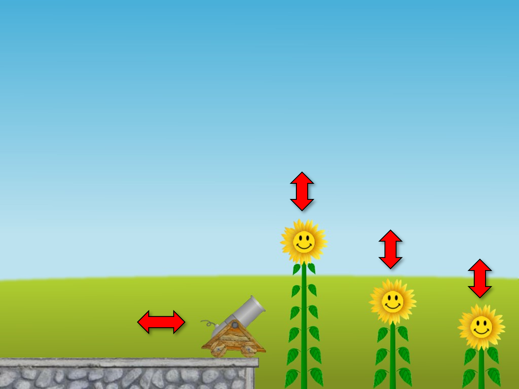 Using the keyboard commands in Section 2, move the flowers up and down and move the cannon horizontally to a new position (see Fig. 2). Verify by experiment that the cannonballs always hit the correct sunflowers at the correct time to play "Twinkle Twinkle Little Star".