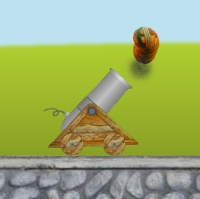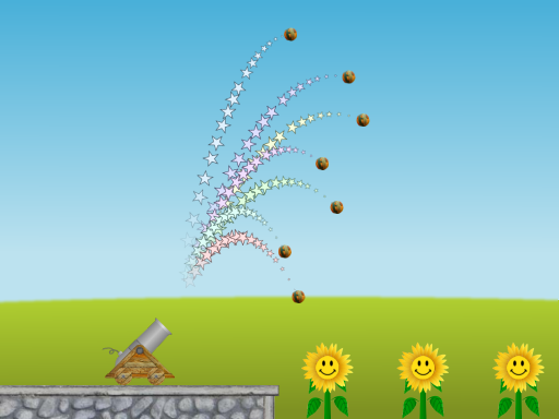 The Cannon Lullaby Toy has three sunflowers, each of which plays a different note when struck by a ball launched from a cannon (see Fig. 1).The cannon fires seven balls simultaneously at different velocities so that the sunflowers play the first seven notes of the classic lullaby "Twinkle Twinkle Little Star". The cannonballs leave trails of stars so that their parabolic trajectories are clearly visible. You can see how these trajectories change when you move the cannon or change the height of the flowers (however, the cannon will break if you drive it over the edge of the platform). The cannon barrel is fixed at about 45 degrees. "Twinkle Twinkle Little Star" is hard-coded as "CCGGAAG" played at about three beats per second, but this is pretty easy to change in the code.
