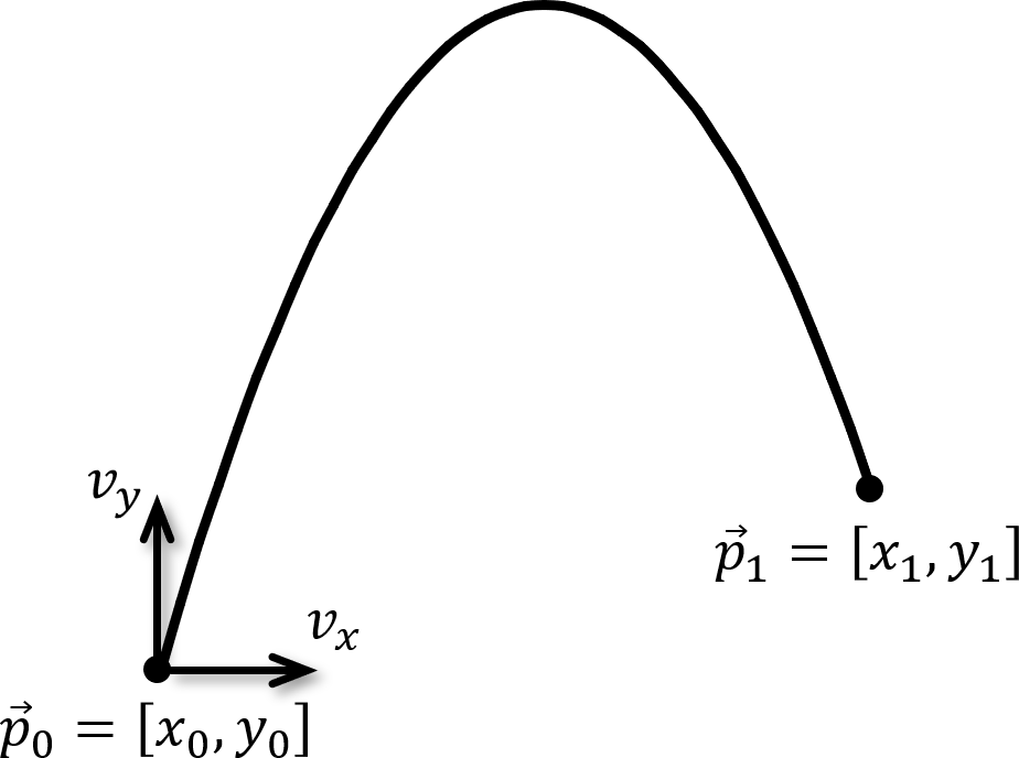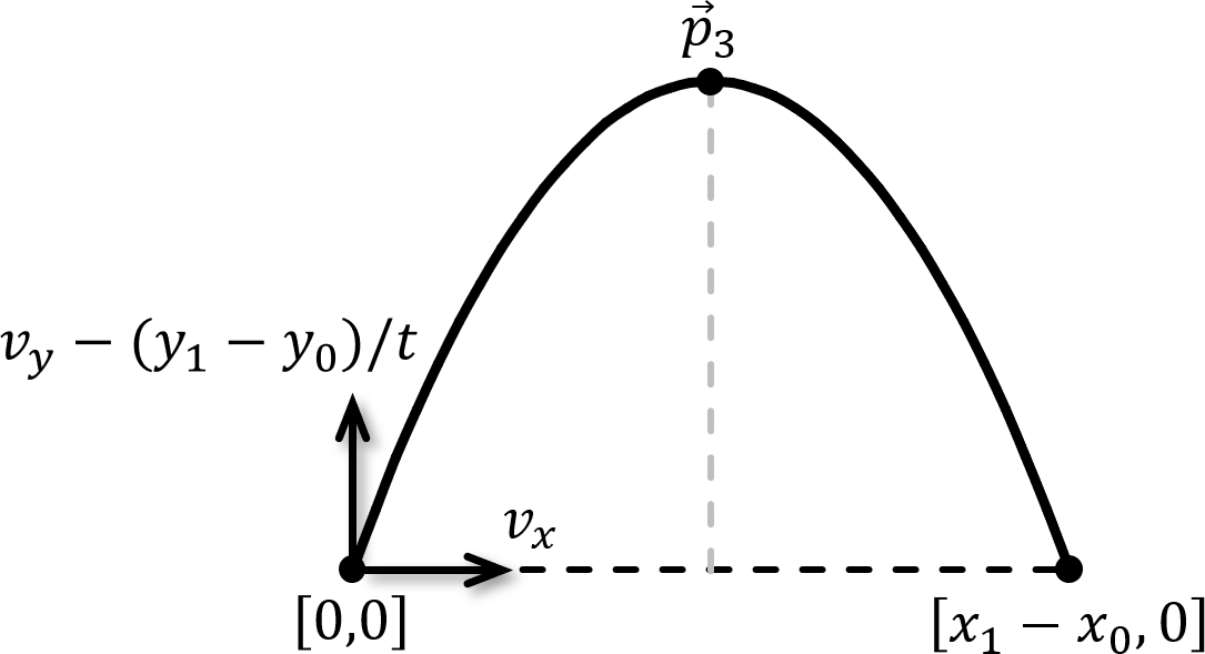 As shown in Fig. 6, we need to find the velocity \(\vec{v} = [v_x, v_y]\) such that a cannonball fired from \(\vec{p}_0 = [x_0, y_0]\) will arrive at \(\vec{p}_1 = [x_1, y_1]\) in time \(t\), for some reasonable \(t > 0\). Clearly, \(v_x = (x_1 - x_0)/t\). The best way to find \(v_y\) is to use relative velocity.