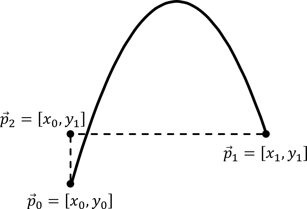 Let \(\vec{p}_2 = [x_0, y_1]\) be the point above \(\vec{p}_0\) and level with \(\vec{p}_1\), as shown in Fig. 7. Consider a point \(\vec{p}\) moving vertically from \(\vec{p}_0\) to \(\vec{p}_2\) at constant speed \((y_1 - y_0)/t\). It leaves \(\vec{p}_0\) at the same time as the cannonball, and arrives at \(\vec{p}_2\) at time \(t\), which is when the cannonball arrives at point \(\vec{p}_1\). Relative to \(\vec{p}\) the cannonball is fired at vertical speed \(v_y - (y_1 - y_0)/t\) and moves on a parabola a horizontal distance of \(x_1 - x_0\).