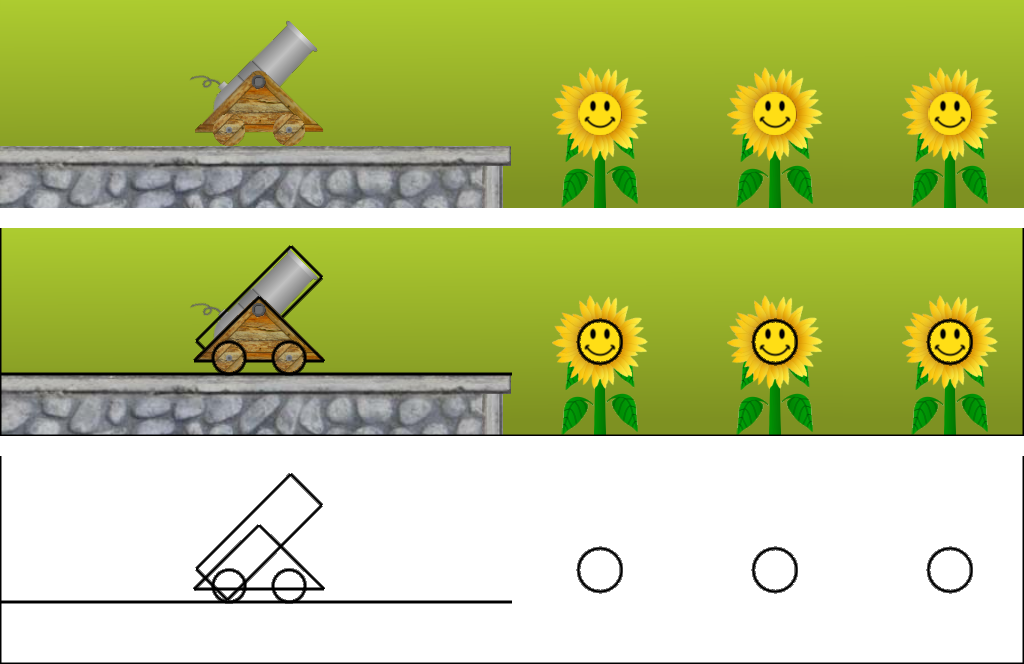 Fig. 3 shows the toy drawn in regular mode with sprites (top), with sprites overlaid with Physics World shapes (middle), and with shapes only (bottom). The edges of the world and the ledge that the cannon sits on are created in CObjectManager::CreateWorldEdges. A pointer to a Physics body to which the edge shapes are attached is stored in CObjectManager::m_pEdges only so that they can be drawn to the window when called for (see Fig. 3). The Physics World circle shapes for the flowers are created in CObjectManager::CreateBells, which calls CObjectManager::CreateBell once for each bell. The Physics World shapes for the cannon are created in CCannon::CreateBase, CCannon::CreateBarrel, and CCannon::CreateWheel, which are called from CCannon::Initialize. The Physics World bodies for the cannonballs are created in CCannon::Fire, which is called from CGame::KeyboardHandler in response to the VK_SPACE key (see Section 2 for more keyboard controls).