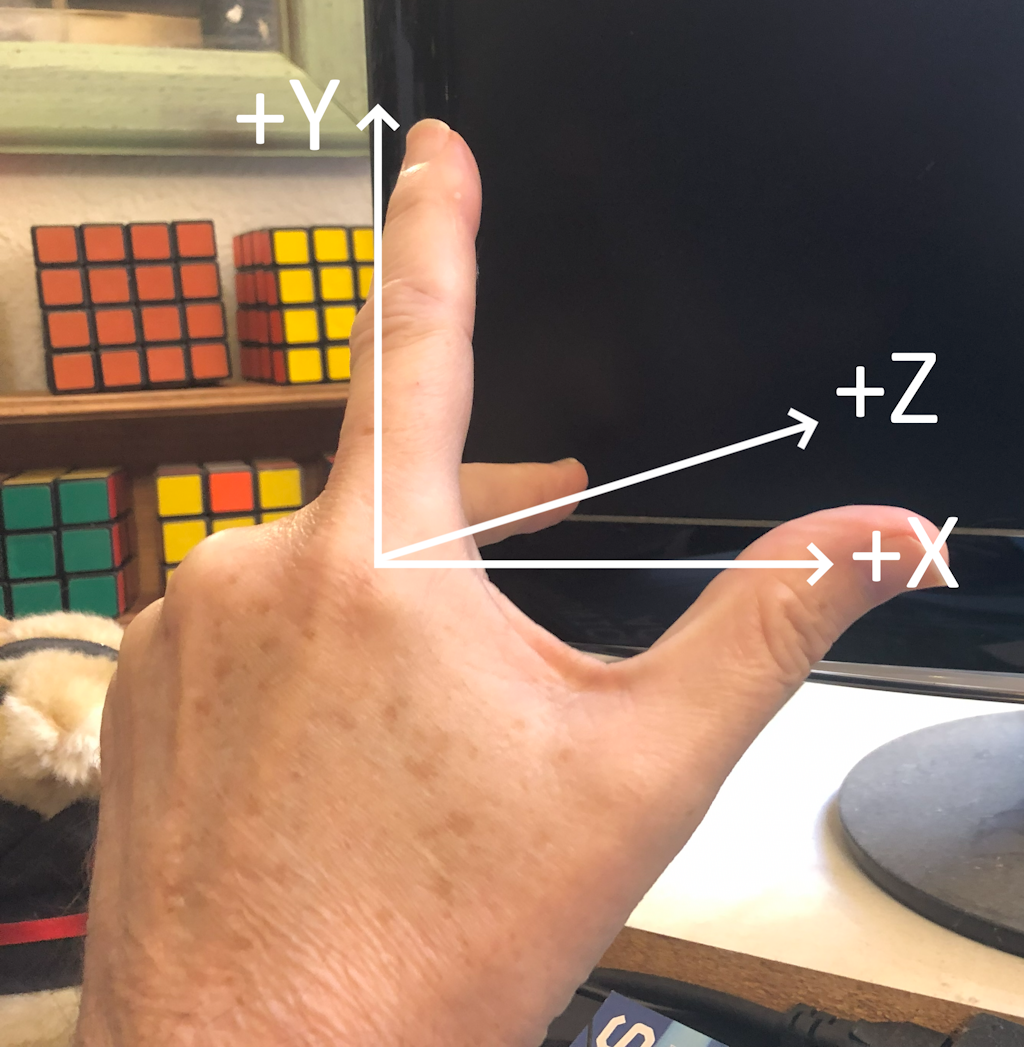 SAGE uses what is called a left-handed coordinate system. Take your left hand and make your thumb point towards positive X, your index finger to positive Y, and put your third finger at right angles to them. Then your third finger points in the direction of positive Z, into the screen as shown in Fig. 3. Similarly, using your right hand points your third finger in the opposite direction, out of the screen, in what is called a right-handed coordinate system.