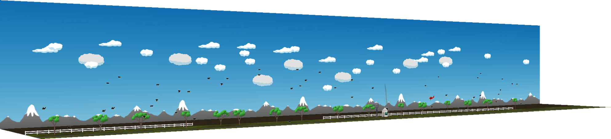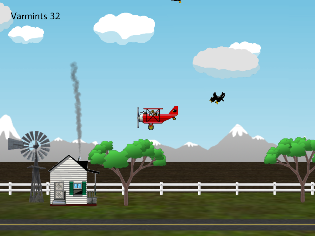 Ned's Turkey Farm is a simple 2.5D side scroller with graphics, particle effects, and sound in which you pilot a plane and kill crows. The plane moves leftwards just to challenge your preconceptions about side scrollers. Fig. 1 shows a screen shot.