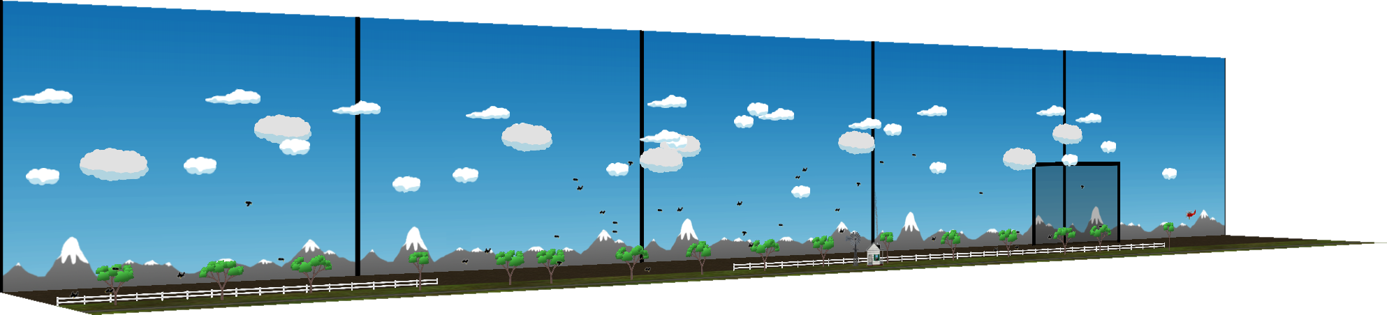 The background cells are drawn by CObjectManager::DrawBackground using CObjectManager::m_cSkyDesc for the sky 3D sprite descriptor and CObjectManager::m_cGrndDesc for the ground 3D sprite descriptor. Notice that CObjectManager::m_cGrndDesc.m_fPitch is set to \(\pi/2\) in CObjectManager::Clear. The number of cells drawn is CCommon::m_nNumCells for the game play area plus an extra cell to the left and right for when the camera is near the leftmost and rightmost edge of the play area, respectively. CCommon::m_nNumCells is set to three, so the game world consists of those three cells plus an extra cell at each end for when the view frustum is at the edge of a cell. This is shown in Fig. 9, which you can see by hitting the F3 key (see Section 2 for more keyboard controls).