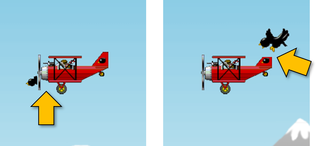 In Fig. 5 (left), the crow's Z coordinate is behind the plane's Z coordinate but the plane is drawn first, resulting in the transparent pixels of the plane sprite canceling out the crow's body (see the yellow arrow) leaving just its head sticking out to the left of the plane. In Fig. 5 (right), the crow's Z coordinate is in front of the plane's Z coordinate but the crow is drawn first, resulting in the transparent pixels of the crow sprite canceling out the part of the plane's tail (see the yellow arrow).