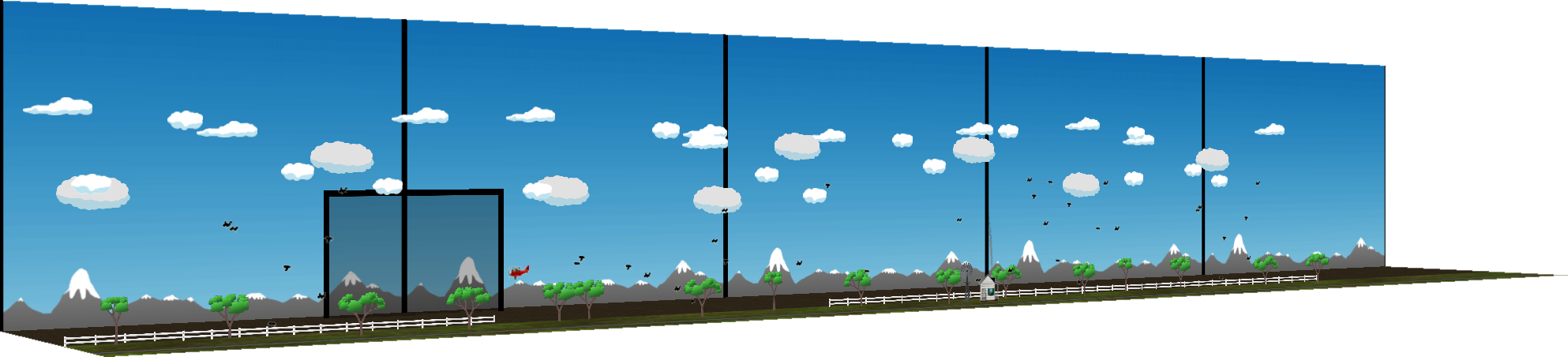 The player is totally oblivious to this and sees a small portion of this world as shown in Fig. 1. They see the contents of the camera's view frustum, the back face of which is drawn as a back rectangle in Fig. 10 and Fig. 11. Fig. 10 shows the plane in its initial position to the right of the game world with the view frustum allowing a view of the background approximately inside the black rectangle. Lines are also drawn on the sky background so that you can see the boundaries between cells more clearly. You can see how the view frustum moves with the plane by hitting the F3 key a second time. (To return to the player view as shown in Fig. 1, hit the F3 key a third time.)