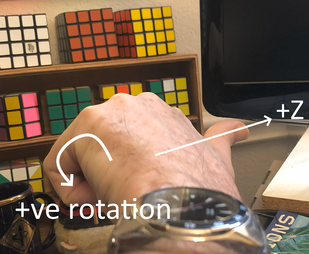 Recall that in 2D we chose positive angles of rotation to be counterclockwise. There is a useful convention for this based on handedness. In a left-handed coordinate system take your left hand, make a fist with your thumb sticking out and pointing along the positive Z axis. Look at your curled fingers from the negative Z side. The direction that they curl is a positive angle of rotation along the Z axis. Your can see from Fig. 4 that this is a counterclockwise direction, which is consistent with our 2D games. You can find the direction of positive rotation about any axis by pointing your thumb in the positive direction and viewing the curl of your fingers from the negative side of the axis.