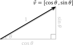 Compute a unit vector at an angle measured in radians counterclockwise from the positive X-axis. If \(\vec{v} = [v_x, v_y]\) is a unit vector with tail at the Origin and \(\theta\) is the angle between \(\vec{v}\) and the positive X-axis, then \(\sin \theta = v_y\) and \(\cos \theta = v_x\). Hence, \(\vec{v} = [\cos \theta, \sin \theta]\), as shown below. Therefore, this function returns Vector2(cosf(theta), sinf(theta)).