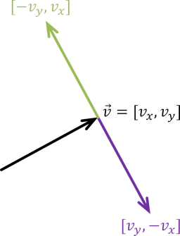 Compute the counterclockwise unit perpendicular to a vector. If \(\vec{v} = [v_x, v_y]\), then both dot products \(\vec{v} \cdot [-v_y, v_x]\) and \(\vec{v} \cdot [v_y, -v_x]\) are equal to zero, and therefore both \([-v_y, v_x]\) and \([v_y, -v_x]\) are perpendicular to \(\vec{v}\). The former (drawn in green below) points counterclockwise from \(\vec{v}\) and the latter (drawn in purple below) points clockwise from \(\vec{v}\). Therefore, this function computes Vector2(-v.y, v.x) and normalizes it before returning it.