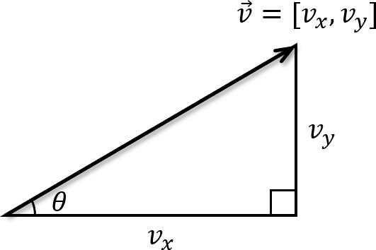 Compute the angle to a vector measured in radians counterclockwise from the positive X-axis. Suppose \(\theta\) is the angle between a vector \(\vec{v} = [v_x, v_y]\) and the positive X-axis (see the image below). Then \(\tan \theta = v_y/v_x\), that is, \(\theta = \arctan v_y/v_x\).
