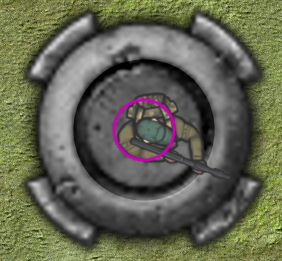The object manager CObjectManager is declared in ObjectManager.h and defined in ObjectManager.cpp. It is derived from Sage::CObjectManager<CObject>. CObjectManager::NarrowPhase performs collision detection and response for two objects. It gets called once per pair of objects in Sage::CObjectManager<CObject>::BroadPhase. If the bounding circles of the two objects overlap, then it calls both object's CollisionResponse functions, which by the power of virtual functions will be either CObject::CollisionResponse, CPlayer::CollisionResponse, CGuard::CollisionResponse, or CBullet::CollisionResponse, depending on the object type. Bounding circles have a radius of CObject::m_fRadius and are centered at CObject::m_vPos, that is, the object's center of rotation. As described in Section 2, hitting F3 on the keyboard will toggle the drawing of the guard's and the player's collision circles as shown in Fig. 8. Note that since the bounding circle of the player and the guard are more-or-less tightly inscribed around their respective torsos, only bullet hits to the torso will count.