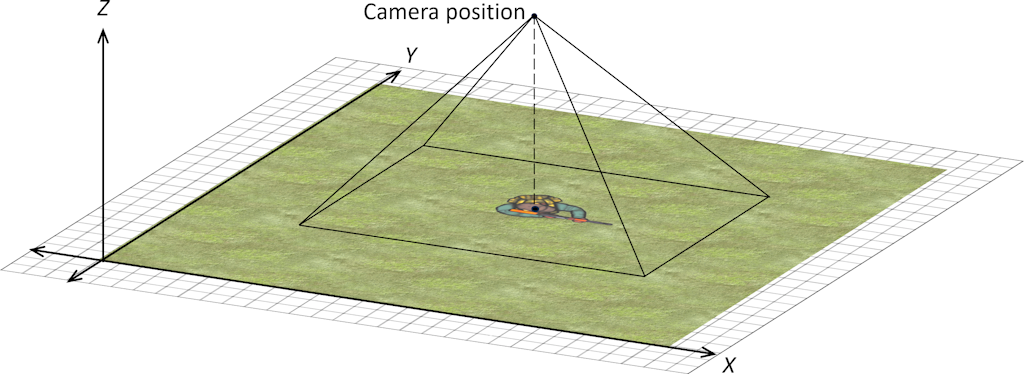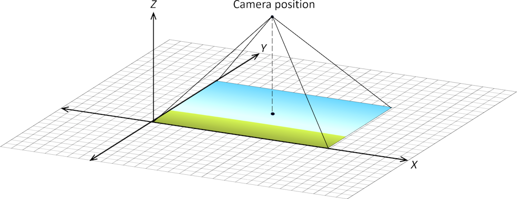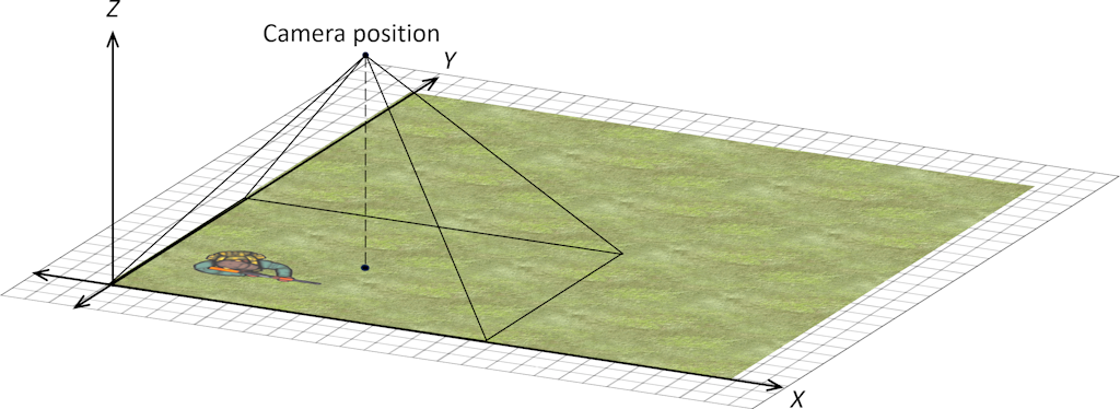 In The Blank Game you probably weren't even aware of the camera, which is positioned above the center of the background along the Z axis (see Fig. 9). Everything in the view frustum, the pyramid drawn with its apex at the camera position in Fig. 9, is projected onto the window, so that everything appears to be in 2D, not 3D.