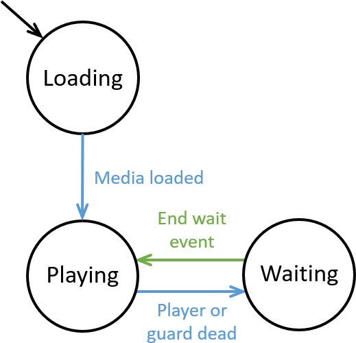 The game state machine is shown in Fig. 12. The circles represent the three states. The arrow into the top state indicates that it is the initial state. The other arrows represent transitions between states and have labels indication the conditions required for a change of state along that transition. The blue arrows indicate Boolean conditions in the code. The green arrows indicate events that need to be triggered.