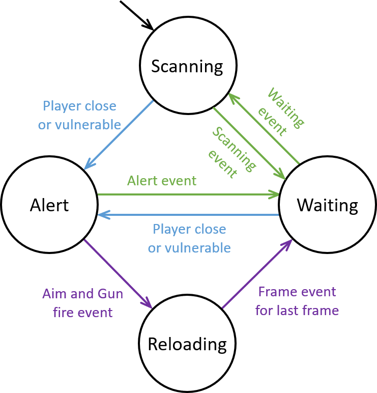 CGuard::ChangeState is called whenever the guard's state is to be changed. It sets m_eState to the new state and sets various other variables in a switch statement that depends on the new state. Instances of Sage::CEventTimer pointed to by m_pWaitEvent, m_pAlertEvent, and m_pScanningEvent are used to move out of CGuard::eState::Waiting, CGuard::eState::Alert, and CGuard::eState::Scanning, respectively, after the appropriate amount of time has passed. The guard moves out of state CGuard::eState::Reloading once all frames of the reloading animation have been displayed.