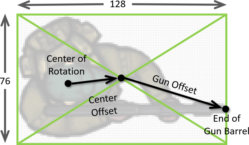 These sprites will be drawn by CArmedObject::Draw() with the center of sprite's cap at the object's position and they should rotate about that point. In order to do this we need the vector offset from the center of the object to the center of the sprite, called the center offset (see Fig. 3). This will be stored in protected member variable CArmedObject::m_vCenterOffset. We will also animate a muzzle flash particle effect at the end of the gun barrel. To do this we need the vector offset from the center of the sprite to the end of the gun barrel, called the gun offset (see also Fig. 3). This will be stored in protected member variable CArmedObject::m_vGunOffset.