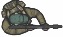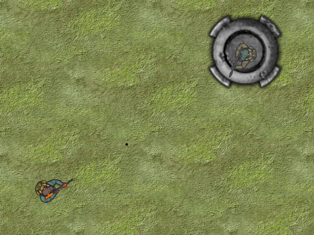 The background is a simple image and the world size is its width and height, which are larger than the window. The camera follows the player but it stops at the edges of the world so that you never see anything that is outside the world. Bullets persist until they run into something, either the player, the guard, or the edges of the world, at which time a particle engine is used to mark the point of impact (a blood spatter or a small cloud of dust). The guard rotates but does not move from the bunker.