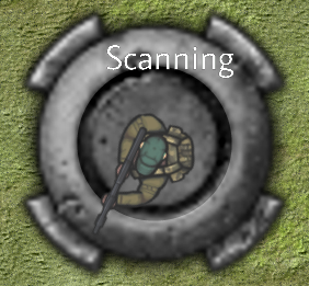 CGuard::eState::Alert - aware of player and firing at it.CGuard::eState::Waiting - not rotating, just staring off into the distance.CGuard::eState::Scanning - turning slowly either clockwise or counterclockwise.CGuard::eState::Reloading - reloading the gun and displaying the Reload Animation.CGuard has a protected member variable m_eState of type CGuard::eState that stores the guard's current state. As described in Section 2, hitting F4 on the keyboard will toggle the drawing of white text describing the guard's current state. For example Fig. 4 shows the guard in state CGuard::eState::Scanning. This text is drawn by calling the protected member function CGuard::DrawState from CGuard::Draw. CGuard::DrawState calls CGuard::GetStateString to convert m_eState to a (wide) string that is then drawn to the screen by calling Sage::CRenderer3D::DrawScreenText, which is inherited by Sage::CSpriteRenderer.
